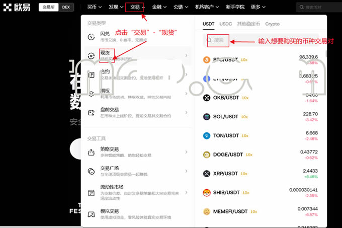 进入交易页面:在交易所的左上角,点击【交易】选项,然后选择【现货】。