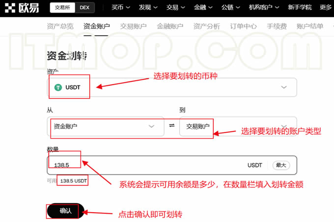 执行资金划转:在资产管理页面中,选择【资金划转】。然后,从下拉列表中选择您要划转的币种,例如USDT(如果您打算用USDT购买ADA)。