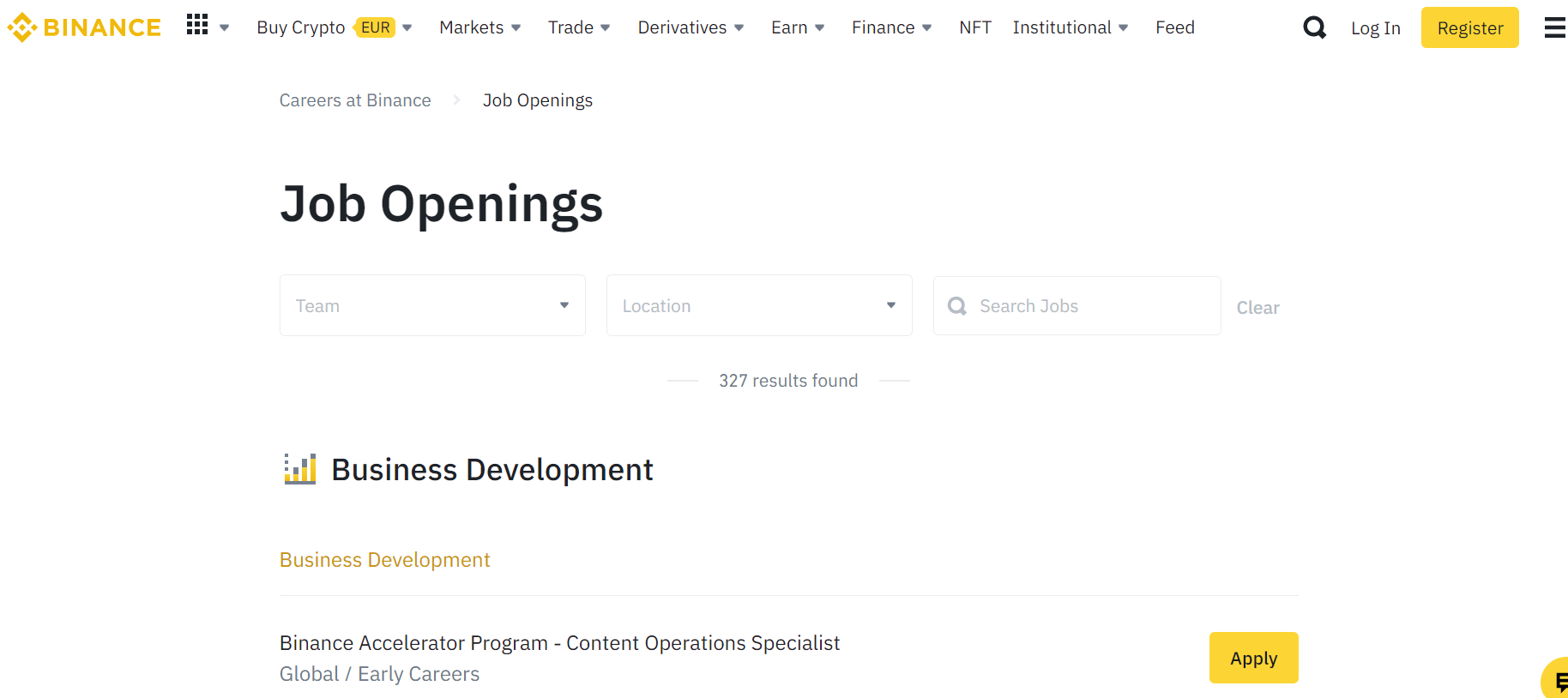 若打开币安的全球招募信息页,显示仍有327种不同地区的职位仍保持开放招募,该裁员消息可能是币安正进行大规模的业务调整。