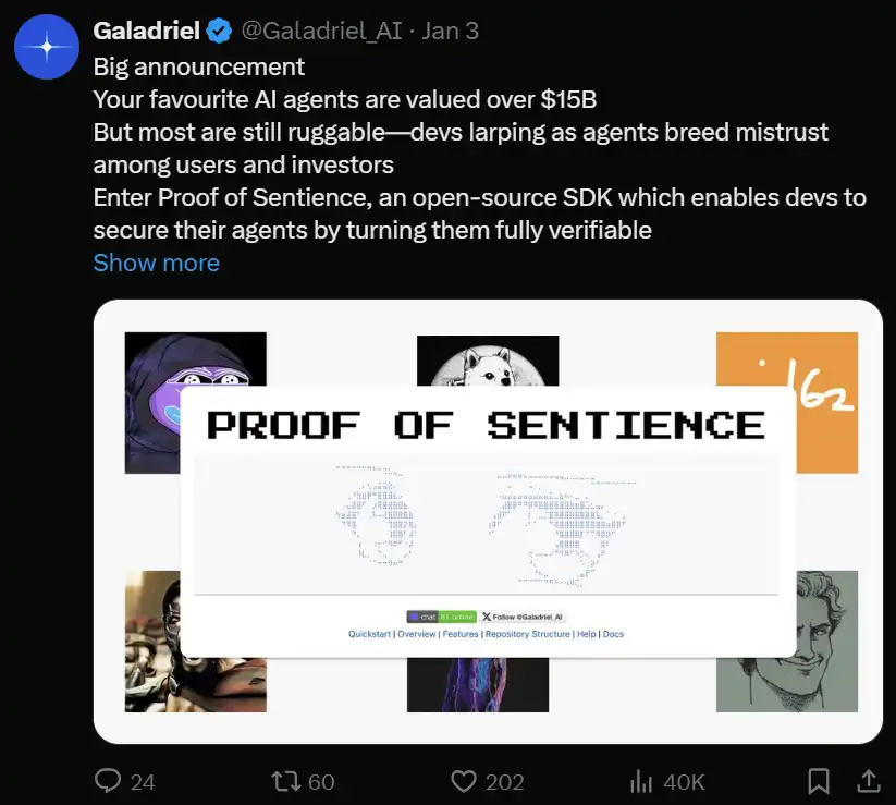 ·galadriel AI 推出了一个名为「Proof of Sentience」的 SDK,允许开发者在链上**验证代理的存在。