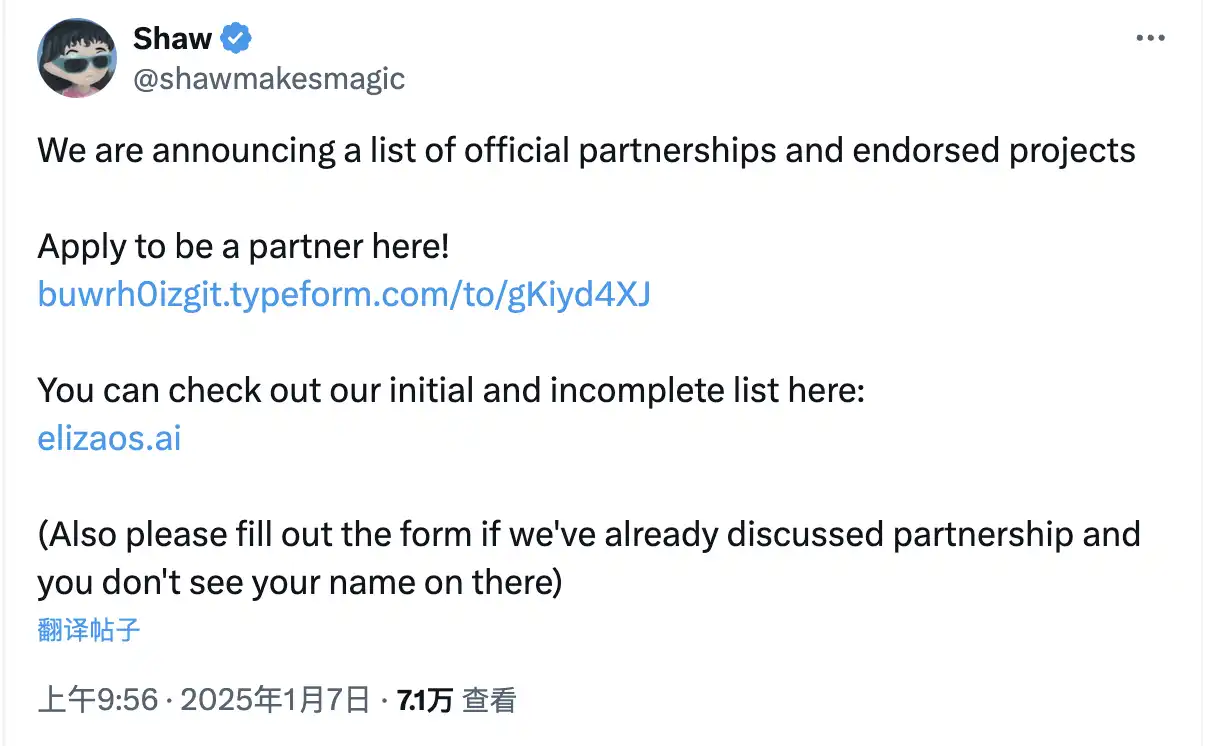 1 月 7 日,Shaw 发文表示,已成立 Eliza Labs 官网公布官方合作伙伴和认可项目清单。在这些合作项目中,除了 Arbitrum、Berachain、EigenLayer、io.net 和 Jupiter Exchange 等基础设施、公链、DEX 等赛道的老牌项目外,大部分为新兴项目,且其中不少发币项目在合作消息公布后展现出明显的价格提振作用。