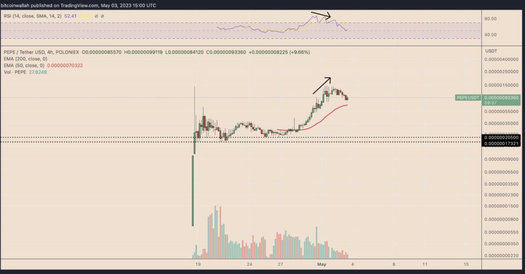 Gola表示虽然PEPE近期突破新高,但其相对强度指数(RSI)已形成自4月30日以来较低的高点,这已构成上涨趋势背离。他认为,该**接下来可能将回测4小时均线。