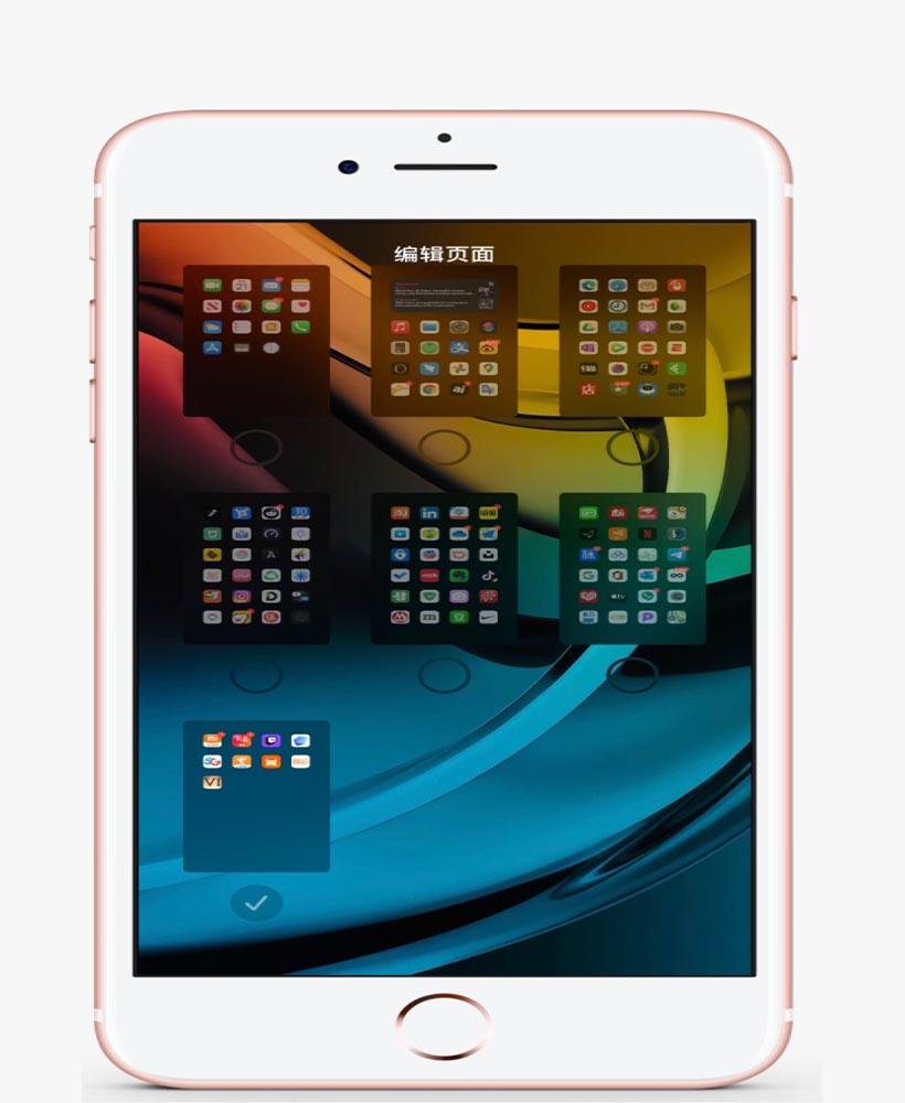 3. 将想要删除的主屏幕缩略图下方取消「打勾」后,**屏 iPhone 点击右上角「完成」或从屏幕底部往上拨返回,非**屏 iPhone 可点击屏幕任意空白区域或点按 Home 按键返回。