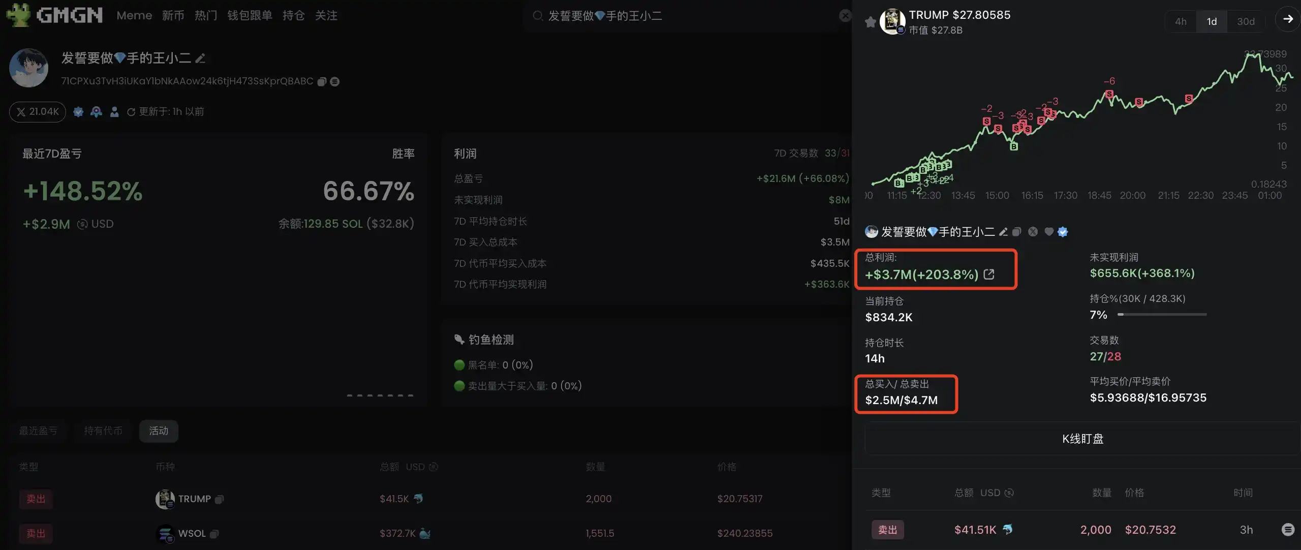 据王小二本人**推文显示,其差点与 TRUMP 失之交臂,但**还是「一路 6 u 均价追了 2.5 m」。根据 GMGN 网站信息显示,其盈利规模超 450 万美元。