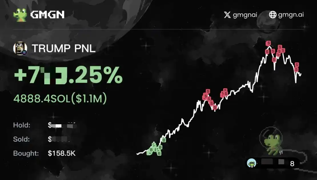 据 0x uezhang 丨 985.eth 本人于发推表示:「**时间用 gmgn 买上了(TRUMP),这个号靠 20 sol 成功打到了 1000 sol。」据 GMGN 网站信息显示,其盈利规模超 100 万美元。