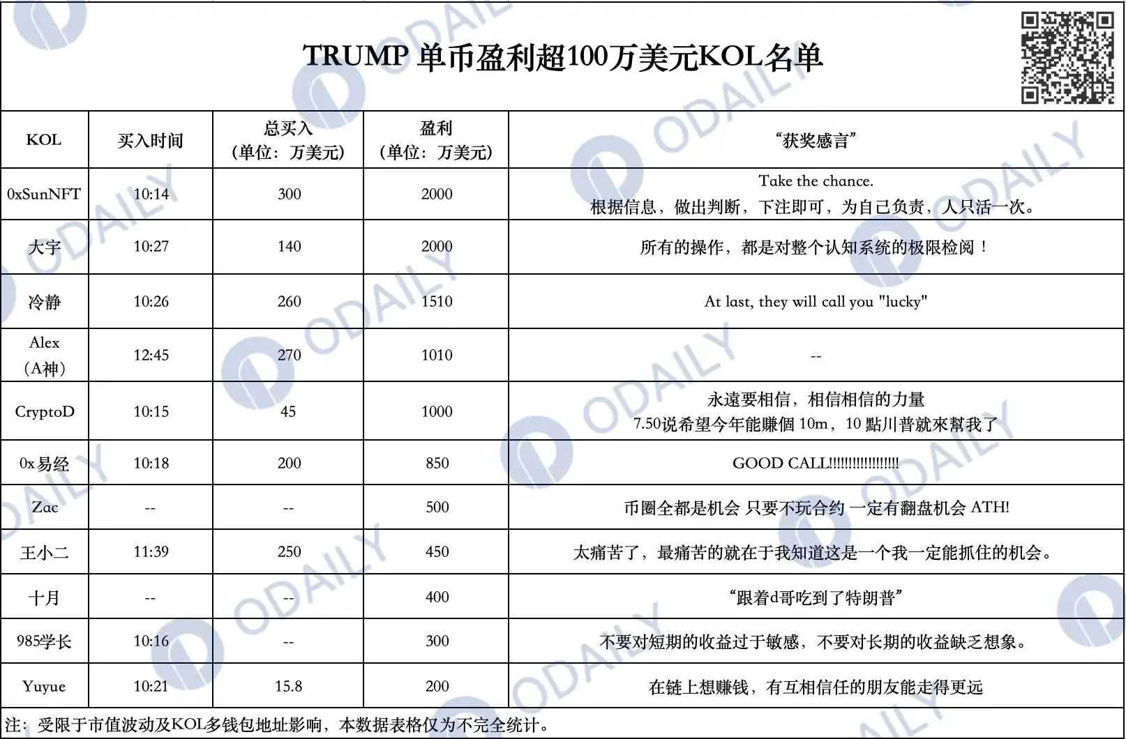 编者语:本文数据统计时间为 1 月 19 日,加之 TRUMP **波动剧烈,部分 KOL 盈利数额或有出入。本文内容仅供参考,不作为投资建议。原文如下:
