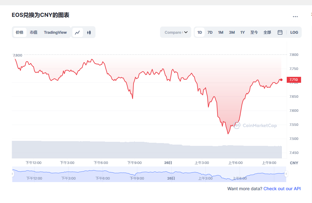 EOS 今日价格 为 ¥7.71 CNY,其 24 小时的交易量为 ¥791,470,356 CNY。 我们会实时更新EOS兑换为CNY的价格。 EOS 在过去 24 小时内下跌了 1.12。 目前的 CoinMarketCap 排名为第 #45 位,其市值为 ¥8,334,937,832 CNY。 其流通供给量为 1,081,263,745 EOS 个货币 目前无法提供供给量上限信息。