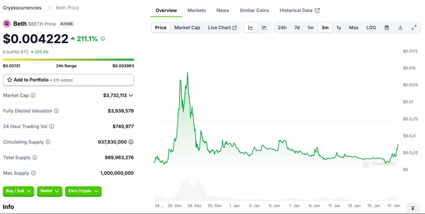根据 CoinGecko 截稿前(2025/1/17)数据显示,Beth(BETH)市值约 3.7M,其价格于过去数个月波动较大,交易需要谨慎留意风险。