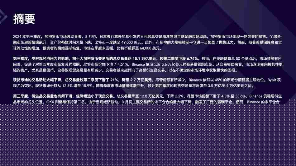 在如此震荡的行情下,交易所情况如何呢?我们准时为大家带来了 2024 Q3 交易所季报。我们在报告中总结了交易所行业的数据表现情况,挑选了**化交易所 Top10,希望通过数据的变化来帮助大家了解交易所市场的变化情况。