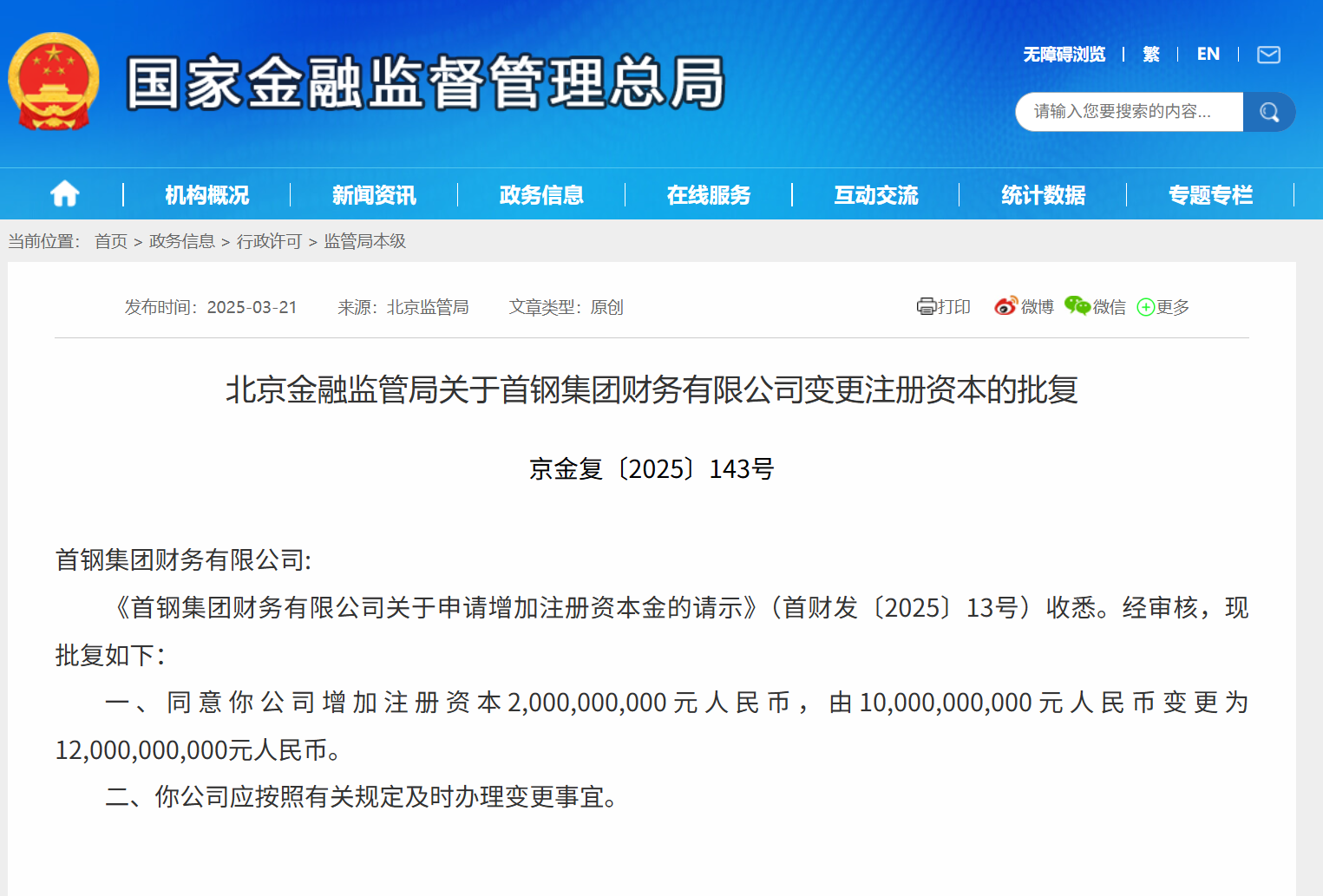 财经3月21日讯 今日,北京金融监管局公布相关批复,同意首钢集团财务有限公司(简称“首钢集团财务公司”增加注册资本20亿元(2,000,000,000元人民币,由100亿元(10,000,000,000元人民币变更为120亿元(12,000,000,000元人民币。以下是相关批复正文: