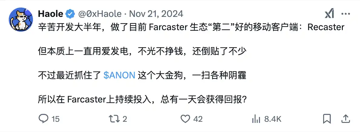 Haole:这一年主要在做 Recaster,一个基于 Farcaster 协议的客户端。Modbot, Newcaster 都算是 Farcaster 生态上的工具,并没有投入太多时间。