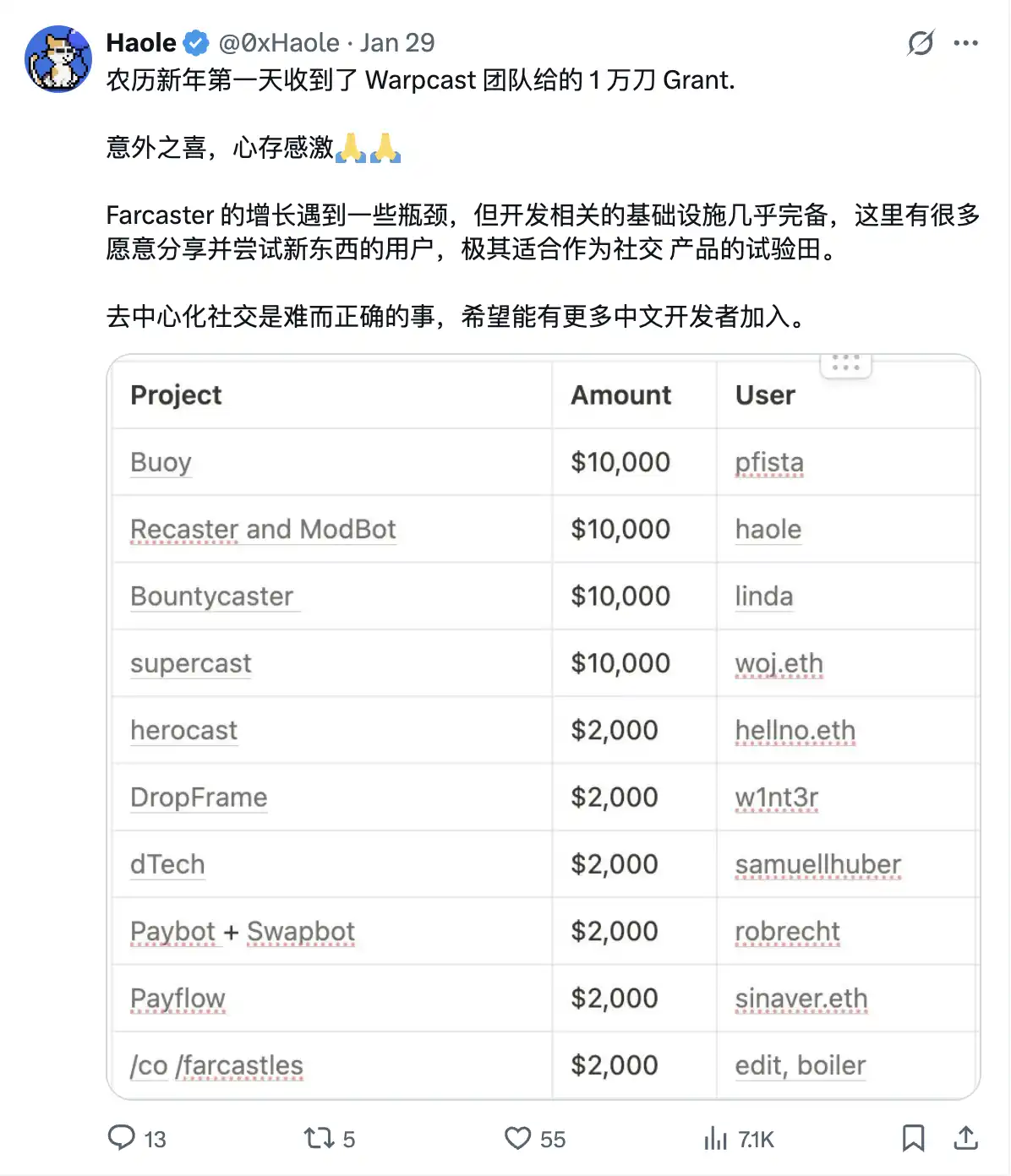 Haole:只要 Farcaster 协议一直在,这个产品就会一直在,因为我的成本太小了。全年运维支出不足 5000 美元,Farcaster 官方给了 1 万刀的 Grants,在我不花钱的情况下,也足够继续维持两年。真要做不下去,只能说明 Farcaster 这个协议死了。