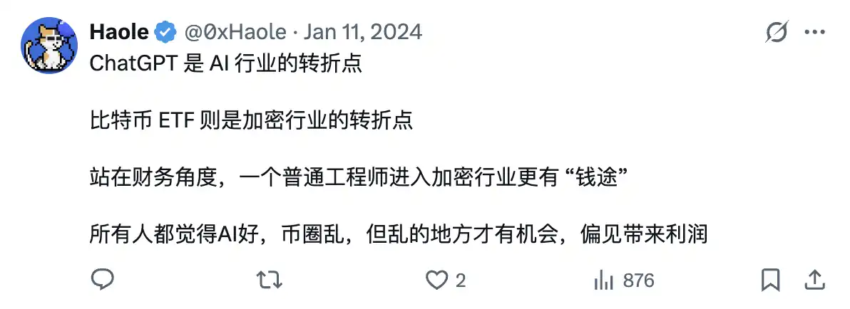 Haole:那个推文其实是 2024 年初发的,刚好是牛市启动前夜。当时所有人都在追 AI 风口,币圈还算比较冷清。后来从三四万美金涨起来的行情确实验证了这点,偏见才有机会和利润。不过最近行情反转了,AI 才是真正的香饽饽。