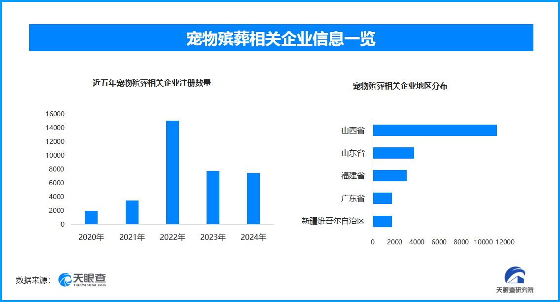 天眼查专业版数据显示,截至目前我国现存在业、存续状态的宠物殡葬相关企业超4.1万家。其中,仅2025年截至目前新增注册相关企业约2100余家,从企业注册数量趋势来看,在2020年宠物殡葬相关企业的注册数量还较低,彼时这个概念仍旧是一个新鲜事物,而在2022年达到了市场爆发期,相关注册企业数量达到了1.5万余家,2023和2024两年开始回归正常增长,均为7000余家左右的数量。