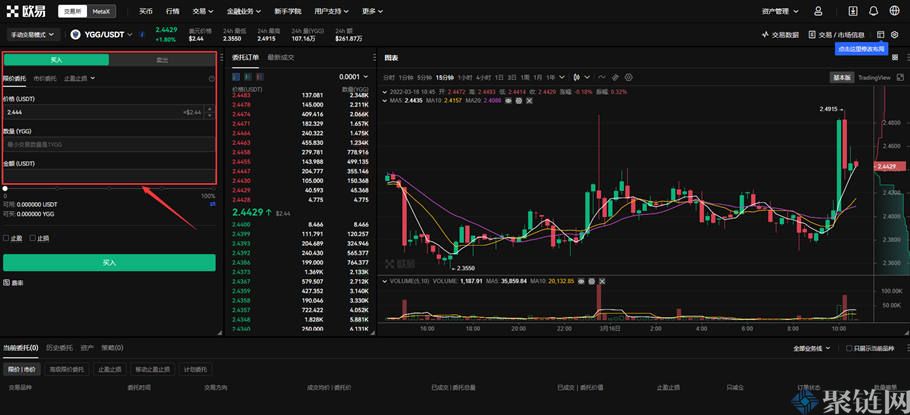 3、点击交易对后会出现交易界面,根据需求购买和交易YGG币