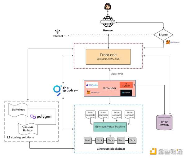与 Web2 应用相比,用户终端与前端是几乎没有什么变化的,不一样在于后端与数据库。用户通过前端与节点提供商互动(而不是某台**化服务器),访问布置在以太坊等区块链上的合约代码(而不是服务器上的后端环境),并进行交互。在这个过程同样会产生上述几种类型的数据,由于技术架构的区别,Web3 产生的数据并不是由一台**化服务器存储,对于不同方式产生的数据其存储的方式或有异同之处。