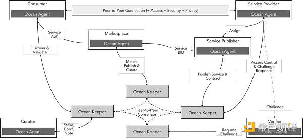 Ocean Protocol 以数据交易市场为核心,建立了一个去**化的数据服务供应链网络。下图显示了创建数据服务供应链所需的主要服务,提供数据、算法、计算、存储、分析和策划。这些组件与服务执行协议(如服务**协议)、安全计算、访问控制和许可绑定在一起。