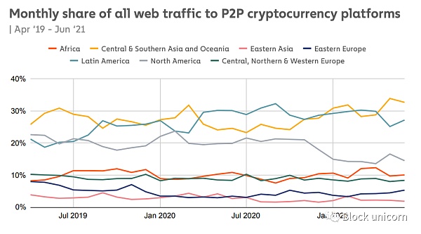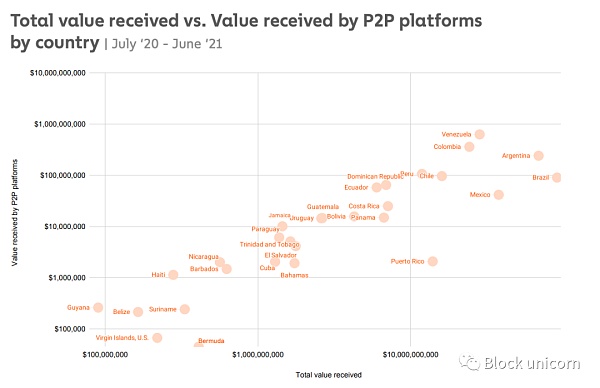 上图显示了每个拉丁美**/地区获得的总价值与通过P2P平台获得的总价值的对比。里面清楚地表明,P2P加密交易率较高的**与目前正在经历社会经济和社会政治冲突时期的**是同一批**。阿根廷、委内瑞拉和哥伦比亚今年都面临着创纪录的货币贬值。哥伦比亚和巴西今年的选举都动摇了两国的核心。尽管Chainalysis的报告没有具体分析P2P交易的采用与一个**基本结构的重大变化之间的关系。但许多报告的数据表明,政治不稳定或社会不平等程度**的**在本土使用加密交易的比率远远高于相同地区不稳定程度较低或没有不稳定的**。