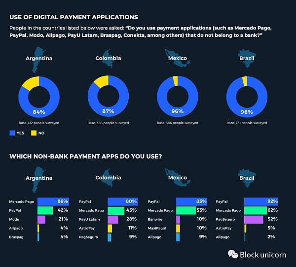 拉丁美洲被证明是新技术的早期采用者,包括电子银行和非银行支付服务、电子商务平台、基于互联网的文本应用程序和加密技术。根据Rapyd的报告,来自阿根廷、巴西、哥伦比亚和墨西哥的1687名受访者接受了问卷调查,而近一半的人仍然没有银行账户。因此,新时代银行和非银行的支付应用程序在全拉丁美洲所有年龄段和社会经济阶层的用户中的受欢迎程度和使用率继续增长。在巴西和哥伦比亚,大多数交易是通过手机进行的,社交商务(即是使用社交媒体应用进行的购买行为。)的采用正在呈指数级增长。