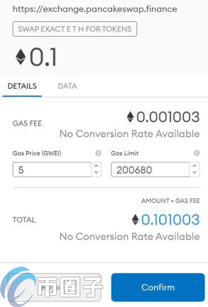 6、此时会出现弹出窗口,请求确认交易,请核对Gas费以及所需花费的总额,点击“Confirm”即可继续。(注意:计价单位是BNB)