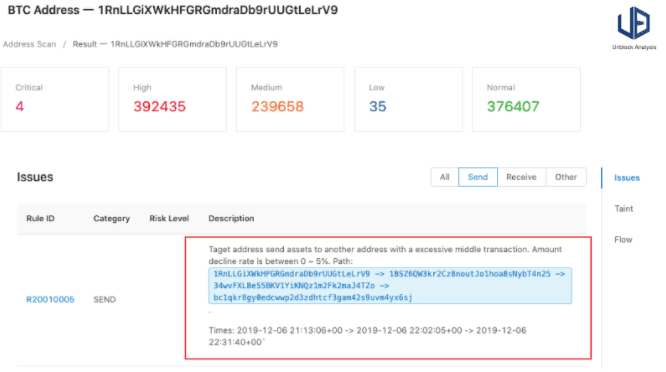 以上(A) 为锁定地址,(B)、(C) 及(D) 为流向地址, 在2019 年12 月6 日当天,资金从(A) 转帐到(B)、(B) 转帐到(C )、再由(C) 转帐到(D),90 分钟内完成资金转移,如此的资金流触发了疑似「白手套(仲介)」的交易行为,更加确信骇客拥有该锁定地址的私钥,当资金进到钱包时随即将资金移转走。
