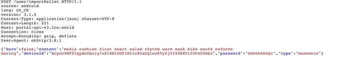 2、在这个过程中,通过抓包分析可以观察到该钱包,将助记词上传至该接口:portal-api-v3.lcs.world/user/importWallet