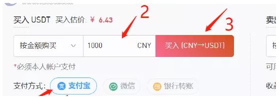 首先,我们选择购买方式,我们可以选择支付宝,或者微信,然后输入你想要买的金额,这里我想买1000块的USTD,**点击买入。