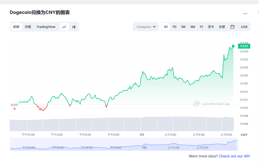 Dogecoin 今日价格 为 ¥0.525600 CNY,其 24 小时的交易量为 ¥1,901,075,492 CNY。Dogecoin 在过去 24 小时内增长了 2.33。 目前的 CoinMarketCap 排名为第 #9 位,其市值为 ¥69,731,722,009 CNY。 其流通供给量为 132,670,764,300 DOGE 个货币。