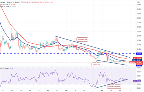 如果价格跌破0.29美元的支撑位,ADA / USDT货币对可能会开始下行趋势的下一站。然后,该货币对可能会跌至支撑线,这可能会吸引买家,因为价格在前两次从该水**弹。