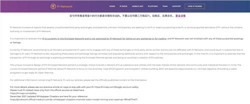 "PI目前在封闭的主网中,不允许外部连接,PI网络不隶属于且未授权给**交易所上架,此类行为可能无法在真正的Pi上运行。参与可能会导致损失,仅信任官方渠道。"