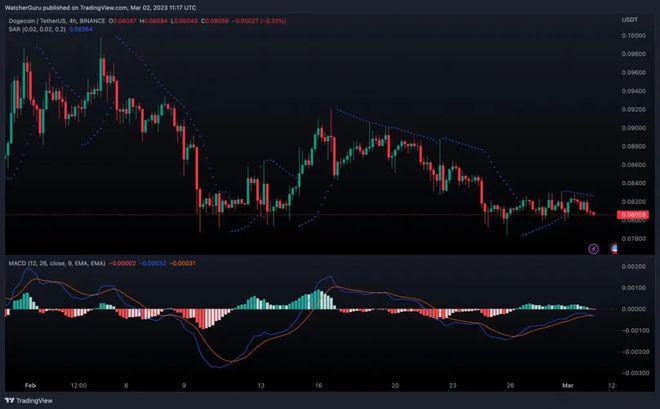 狗狗币的短期价格图表显示看跌观点。抛物线转向指标在烛台上形成虚线,进一步限制了**向上运动。MACD 指标在整个上周和本周初都看涨。然而,信号线正慢慢试图压倒 MACD 线。由此,狗狗币进入看跌领域。