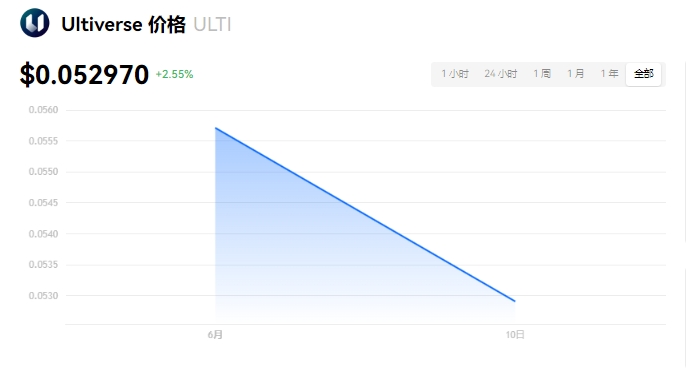 Ultiverse 当前价格为 $0.052970。Ultiverse 的价格在过去 24 小时内上涨了 2.56%。目前,Ultiverse 市值排名为第 0 名,实时市值为 $0.00,流通供应量为 0 ULTI,**供应量为 10,000,000,000 ULTI。我们会实时更新 Ultiverse/USD 的价格。Ultiverse 价格表现 (美元)