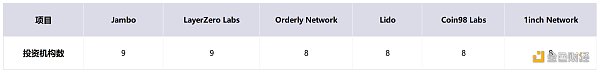 这 30 家机构总计进行了 2543 次投资,投向了 1317 个项目,其中 637 个项目被两个及两个以上机构投资。出现在这个极小的样本中****的被投项目是 Jambo 和 LayerZero Labs,都拿到了 30 家机构中的 9 家的投资,而 Orderly Network、Lido、Coin98 Labs 和 1inch Network 都获得了其中 8 家机构投资。