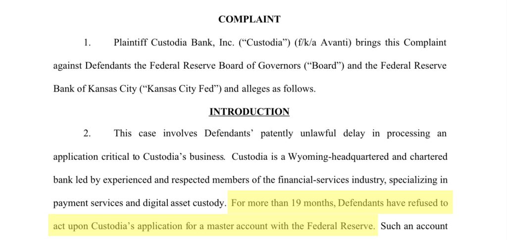 根据诉讼,堪萨斯城联储早在2020年5月就收到了Custodia的商业计划,并确认该公司在2020年10月下旬提交的主账户申请已经完成。堪萨斯城联邦储备银行的一名代表也在2021年初告诉Custodia,申请没有障碍,但迄今为止一直被推迟。