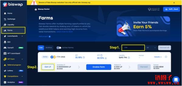 1.进入biswap的挖掘界面(Farms),搜索FTM。