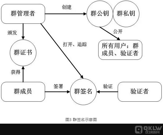 在一个群签名方案中,一个群体中的任意一个成员可以以匿名的方式代表整个群体对消息进行签名。与其他数字签名一样,群签名是可以公开验证的,且可以只用单个群公钥来验证。群签名一般流程: