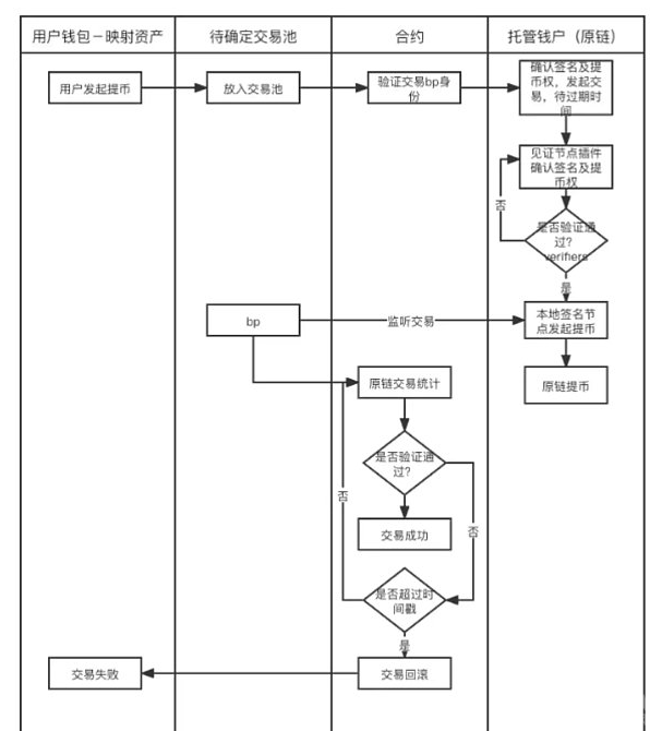 如图所示:一笔从目标链提币到原链的交易流程如下: