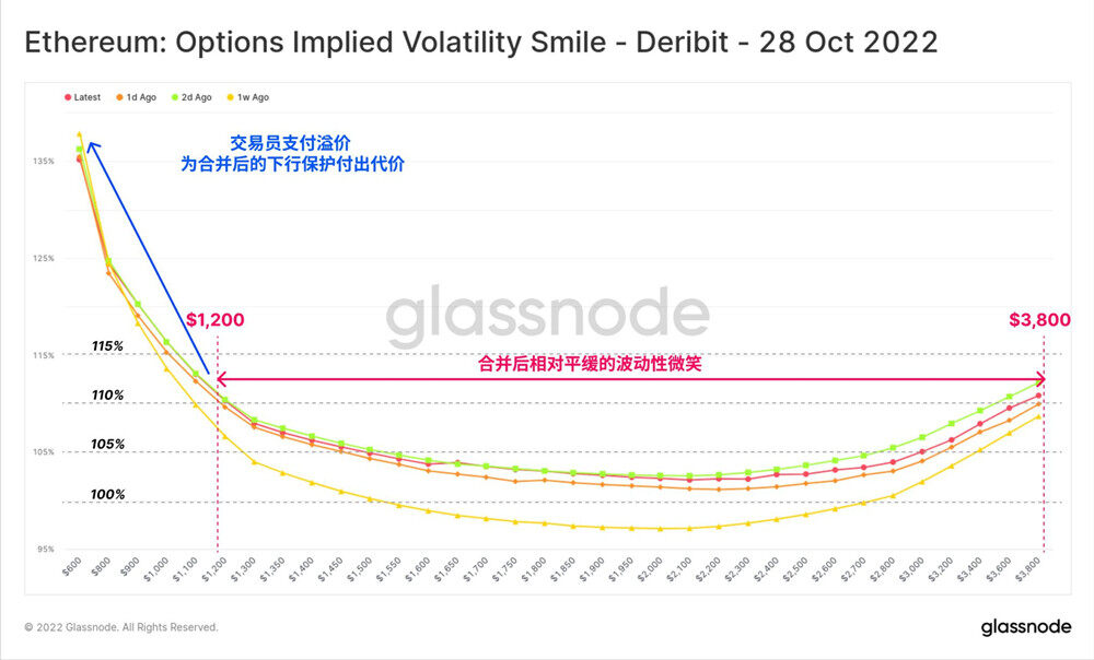 然而,这种趋势在10月份出现明显逆转。报告分析,观察10月份波动率微笑曲线,可以看到右边尾部的急剧下降,形状相对平坦,整个曲线的隐含波动率低于110%。这表明在合并事件之后,对通过期权创建以太坊敞口的需求相对较低。