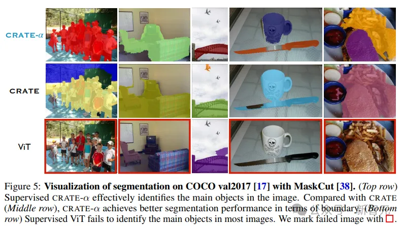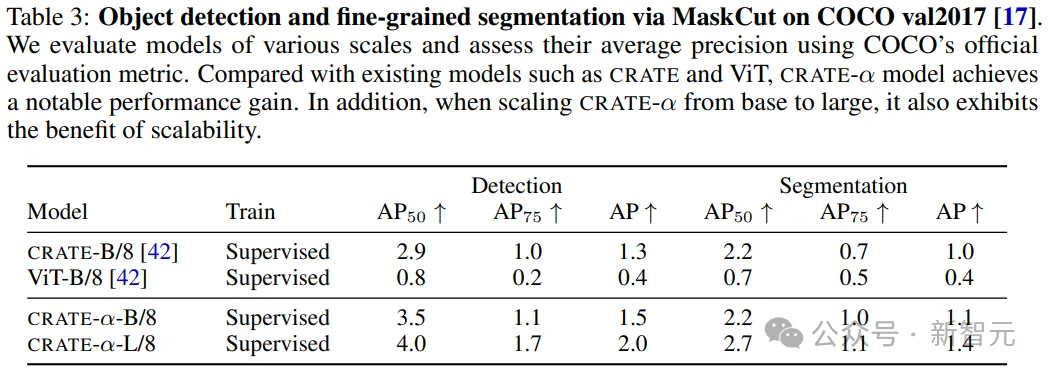 为CRATE-α、CRATE和ViT在COCO val2017上提供了分割可视化后,可以发现,CRATE-α模型保持甚至提高了CRATE的(语义)可解释性优势。