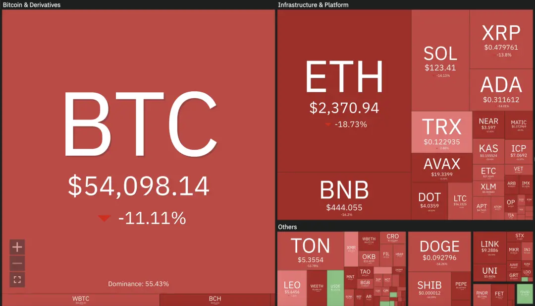 比特币一度跌至54000美元附近,以太坊一度跌至2100美元附近,单日跌幅近20%,24小时爆仓8亿美元,整个加密市场市值跌破2万亿美元。