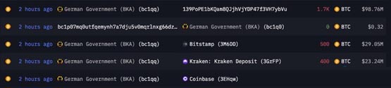 与此同时,德国当局还向Bitstamp发送了500枚比特币;向Coinbase发送了400枚比特币,以及向Kraken发送了400枚比特币。