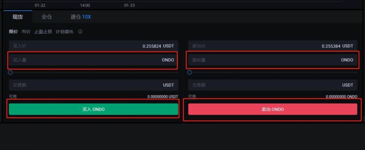 5、输入买入数量,点击买入ONDO币,就完成购买;输入卖出数量,点击卖出ONDO币,就完成出售