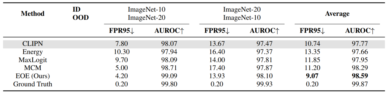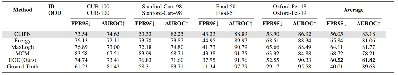 我们在不同OOD任务的多个数据集上进行了实验。表1展示了在ImageNet-1K 上进行Far OOD 检测实验结果,其中,Ground Truth表示使用真实OOD标签时的性能,在实际部署中是不可获取的。结果表明,EOE 与微调方法相当,并超越了 MCM [5]。