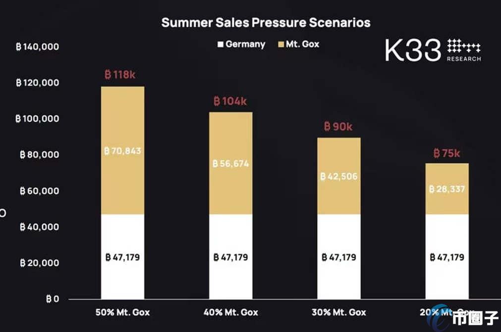 根据K33 Research的估计,市场在夏季将需要吸收来自德国当局、 Mt. Gox客户的卖压,规模估计达75,000枚至118,000枚比特币,按当前价格计算,约为43亿至68亿美元。