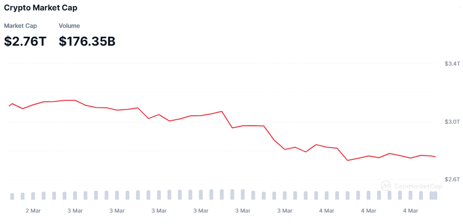 Coinmarketcap的数据显示,全球加密市场总市值现在是2.75万亿美元,24小时内跌了9.67%。交易量也萎缩了3.51%,降到了1856.5亿美元。市场整体表现低迷,CMC 100指数比昨天跌了10.92%,现在是166.44美元。