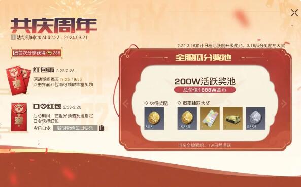 周年庆庆典红包拿不停!本周更新后至2月28日,每天晚间19:25-19:55将有海量红包雨相赠,点击**,可获得丰富好礼。