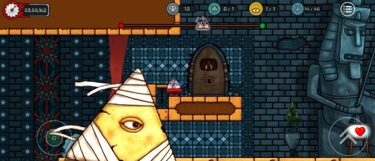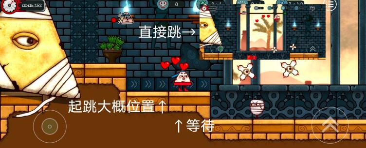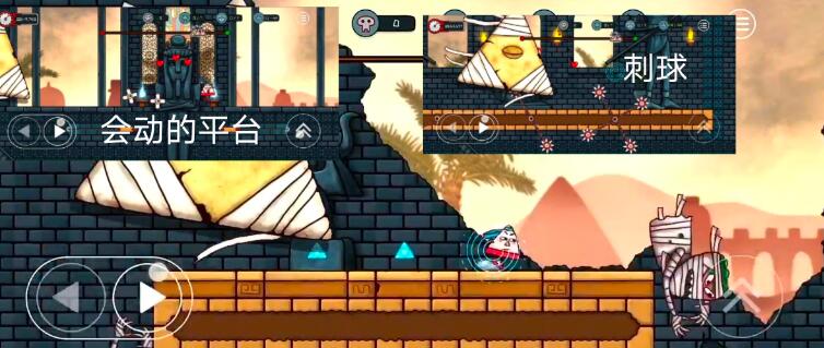 之后是三个根柱子,一个旋转的刺球,两个弹簧的,过了之后会有两个大木乃伊围着转的平台直接走过去别让他碰到你就行,再过了易碎的平台就结束了,这关隐藏在这里↑。