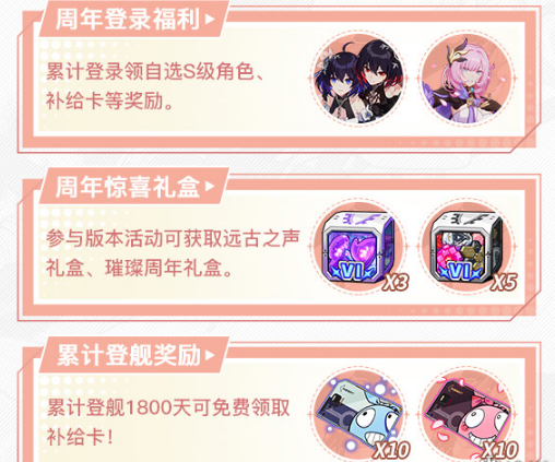 周年登录福利:累计登录领自选S级角色、补给卡等奖励。