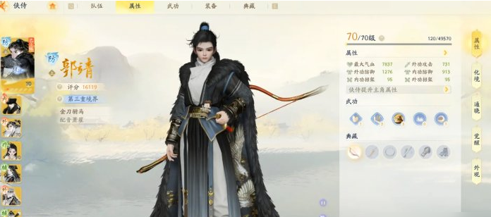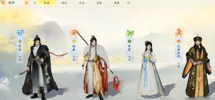 按稀有度从高到低可分为橙、紫、蓝、绿四种颜色,每个侠侍又具有不同的五行属性,比如我们的主角郭靖就是防御职业,金色稀有度,土系侠侍。
