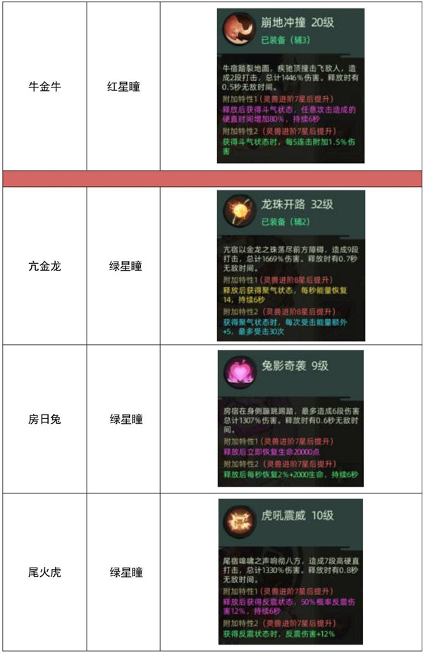 后期:主上阵:角木蛟 心月狐 氐土貉 辅灵:算水豹 亢金龙 牛金牛